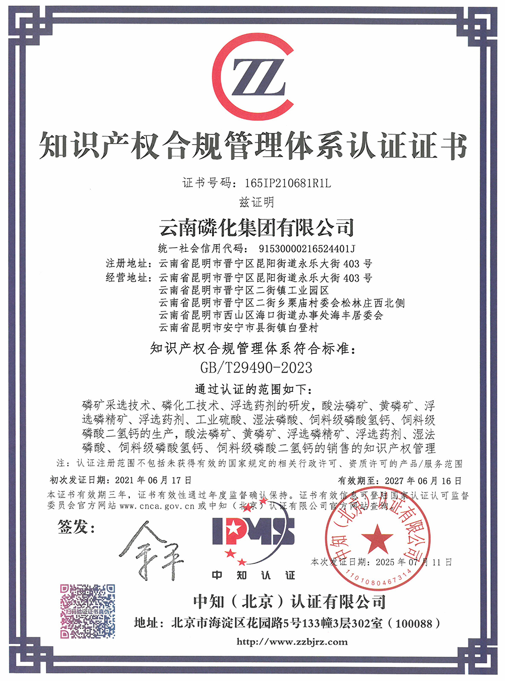 《企業(yè)知識產(chǎn)權(quán)合規(guī)管理體系要求》新標(biāo)準(zhǔn)于2024年1月1日正式實(shí)施,在《企業(yè)知識產(chǎn)權(quán)管理規(guī)范》基礎(chǔ)上對合規(guī)要素、覆蓋范圍和標(biāo)準(zhǔn)結(jié)構(gòu)進(jìn)行了優(yōu)化,為企業(yè)建立知識產(chǎn)權(quán)管理體系、防范知識產(chǎn)權(quán)風(fēng)險、實(shí)現(xiàn)知識產(chǎn)權(quán)價值提供了參照標(biāo)準(zhǔn)。新標(biāo)準(zhǔn)突出了知識產(chǎn)權(quán)管理的合規(guī)屬性,強(qiáng)化了數(shù)字化轉(zhuǎn)型、風(fēng)險防控及國際化合規(guī)要求,旨在推動企業(yè)構(gòu)建覆蓋知識產(chǎn)權(quán)創(chuàng)造、保護(hù)、運(yùn)用及風(fēng)險防控的全生命周期管理體系,強(qiáng)化合規(guī)經(jīng)營能力,提升核心競爭力。此次通過新標(biāo)準(zhǔn)認(rèn)證,標(biāo)志著公司在知識產(chǎn)權(quán)創(chuàng)造、運(yùn)用、保護(hù)和管理等關(guān)鍵領(lǐng)域達(dá)到了新的高度,全面升級至新版國家標(biāo)準(zhǔn)要求,進(jìn)一步鞏固了公司在磷化工領(lǐng)域的技術(shù)創(chuàng)新優(yōu)勢地位。